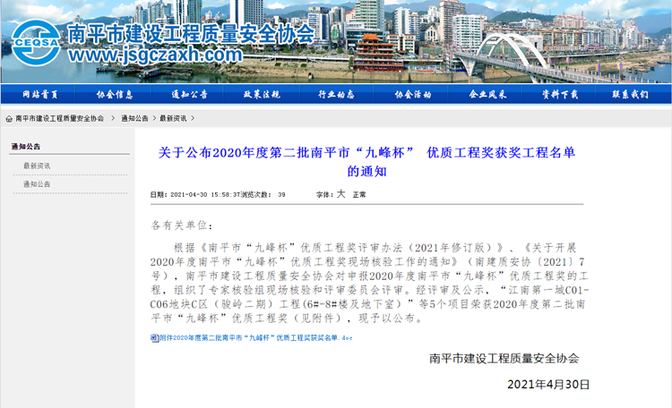4月30日,南平市建設工程質量安全協會公布了2020年度第二批南平市“九峰杯”優質工程獎,由安徽三建公司承建的南平駿嶺二期項目、駿嶺三期項目榜上有名,喜獲“九峰杯”優質工程獎,該獎項是南平市建設工程最高獎項。