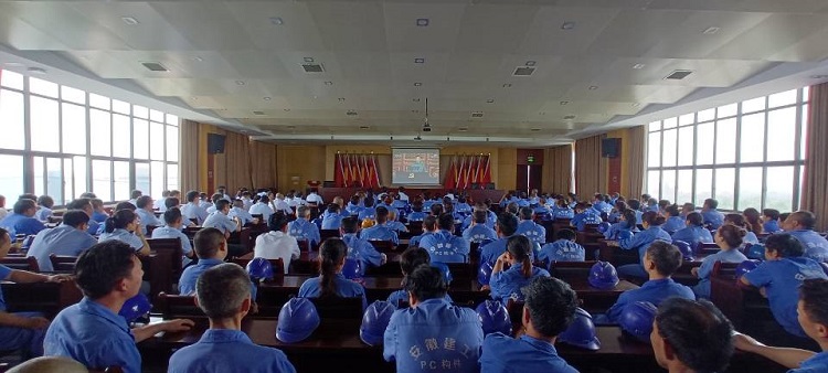 在公司重點項目——六安一中項目現(xiàn)場,來自所屬四公司、安裝公司、裝飾公司的30余名管理人員集中收看大會直播