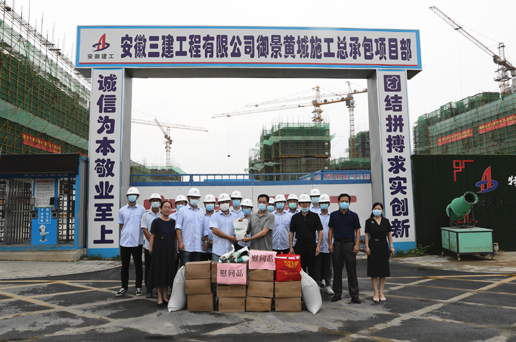 8月9日下午,建工控股黨委委員、副總經理、總工程師戴良軍深入安徽三建御景黃城項目施工現場慰問奮戰在一線的干部職工,為項目管理人員送上綠豆、白糖、毛巾、仁丹、洗發水等清涼洗護用品,為職工送來集團的關心和問候,并在項目部召開了座談會。股份公司工程管理部部長葛輝,三建公司黨委書記、董事長左登宏,黨委副書記黃麗春等參加慰問、座談。