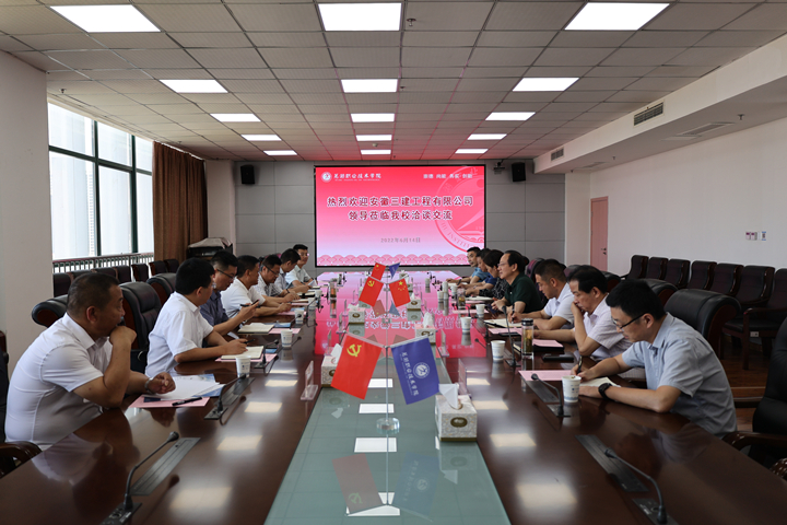 6月14日上午9點,安徽省援藏協會副會長、安徽建工集團控股有限公司原紀委書記宋志華,公司黨委委員、副總經理王興明,副總經理樊剛等一行赴蕪湖職業技術學院考察交流。蕪湖公司黨支部書記、經理呂遠等陪同考察,蕪湖職業技術學院黨委書記汪斌,黨委委員、副校長季慕寅,副校長劉育紅等接待到訪一行并召開座談會。