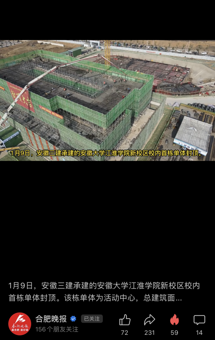 1月9日、10日,合肥晚報(bào)視頻號(hào)、江淮晨報(bào)先后報(bào)道公司承建的安徽大學(xué)江淮學(xué)院新校區(qū)項(xiàng)目建設(shè)取得的最新進(jìn)展。