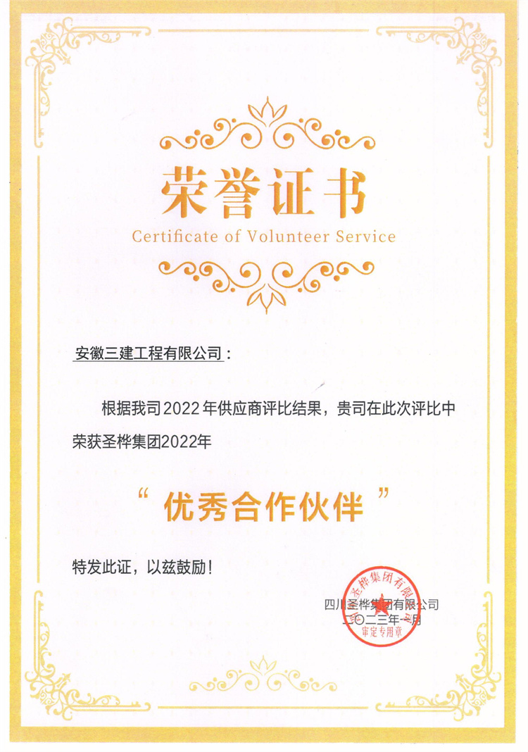 日前,公司獲四川圣樺集團2022年度“優(yōu)秀合作伙伴”榮譽,同時圣樺集團還發(fā)來感謝信,對項目克服多重困難保質(zhì)保量完成施工任務(wù)表示充分肯定和感謝。