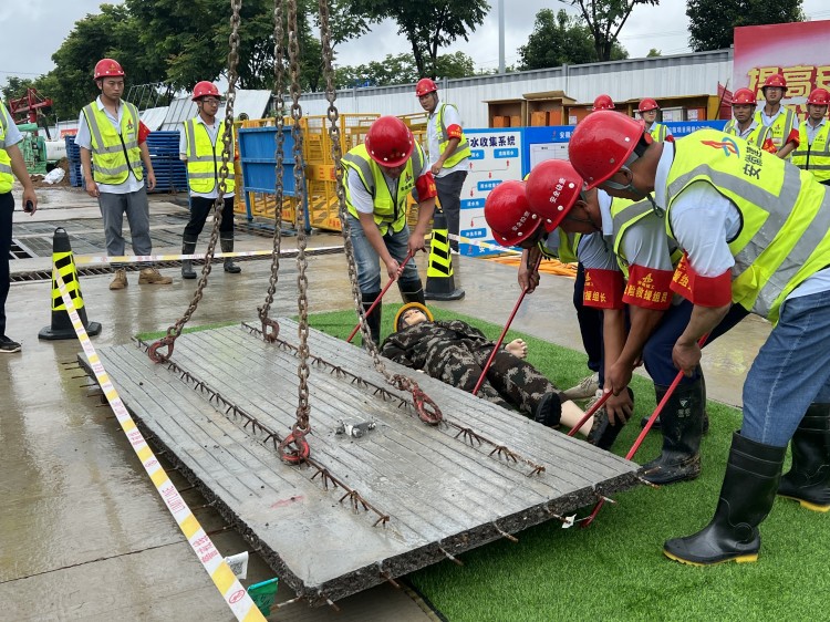 演練真實地模擬了人員遭遇安全事故的應急處置及救援過程。模擬人員在進行疊合板拼裝過程中,由于吊索斷裂,吊物在倒下過程中,不幸將地面一名工人腳掌砸傷,受傷工人的右腳掌被吊物壓住,發生起重傷害安全事故,項目及時組織開展科學、有效的救援。