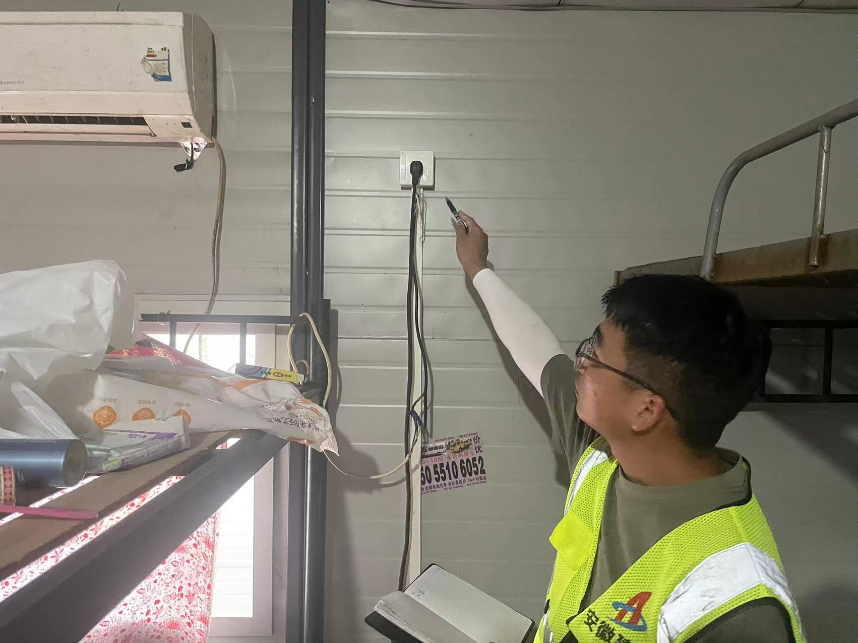 首先,由專職安全員對公共區域的臨電設施進行檢查,并向工人宣傳用電知識,增強其安全用電、節約用電意識。查看公共部位所有的漏電保護開關、保險絲、盒、閘刀等情況,及時解決所發現問題,做到防患于未然。隨后,檢查公共區域的消防設施,對滅火器是否失效、配備是否齊全進行了排查,同時檢查消火栓內消防水帶和消防槍是否齊全、消防水是否可用等,對缺失的消防水帶立即整改,保障生活區消防安全。