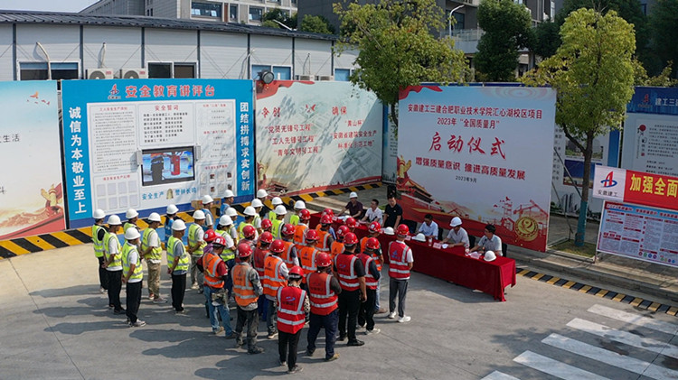 9月11日上午,八分公司合肥職業(yè)技術(shù)學(xué)院匯心湖校區(qū)項目召開2023年“質(zhì)量月”活動啟動儀式,新站區(qū)建筑質(zhì)量安全監(jiān)管中心副主任袁大為、八分公司副經(jīng)理李江順等人參加活動。