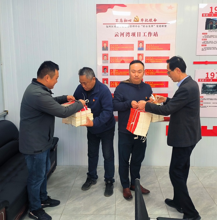 在黨員活動室,闞言衛代表包河區重點局向工作站捐贈了一批黨建、業務和法律法規等方面書籍,并號召項目黨員、職工多讀書、勤學習,不斷提升政治素養和崗位技能。