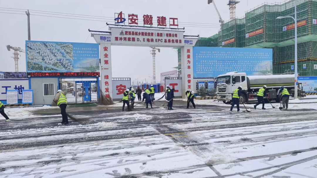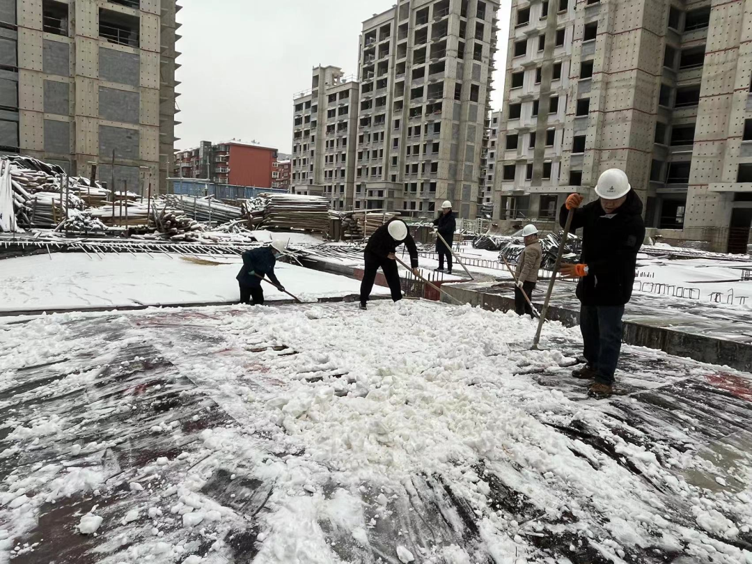 蜀山經(jīng)濟產(chǎn)業(yè)園建設(shè)項目現(xiàn)場,為保障項目的施工進度和現(xiàn)場的施工安全,全體管理人員都參與到清掃施工板面積雪的活動中。