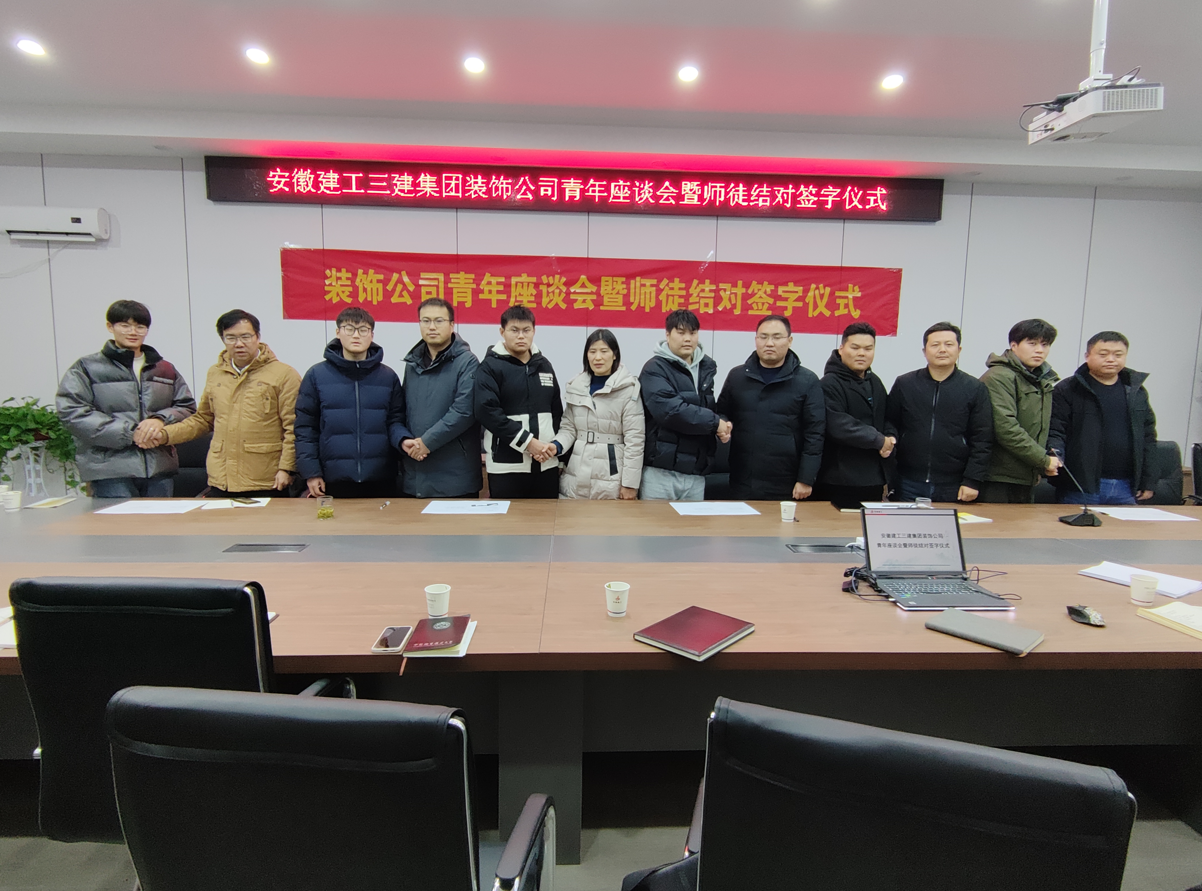 為了進一步將“師帶徒”活動落到實處,幫助青年職工快速成長。12月18日下午,裝飾公司在安徽(合肥)創(chuàng)新法務(wù)區(qū)項目會議室開展青年職工座談會暨師徒結(jié)對儀式。裝飾公司班子成員、部分科室負責人、項目經(jīng)理、優(yōu)秀青年職工代表以及今年新進場大學(xué)生共25余人參加。