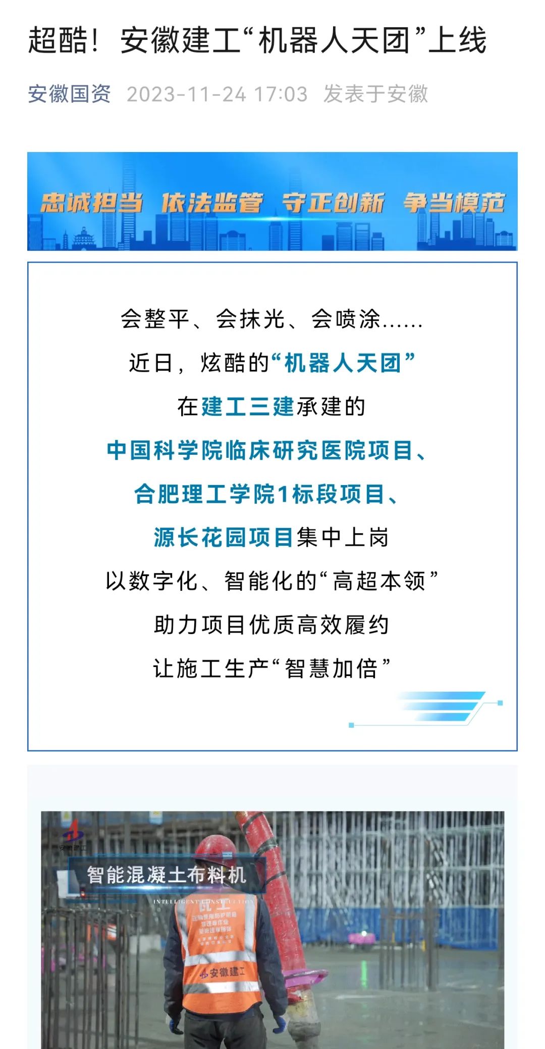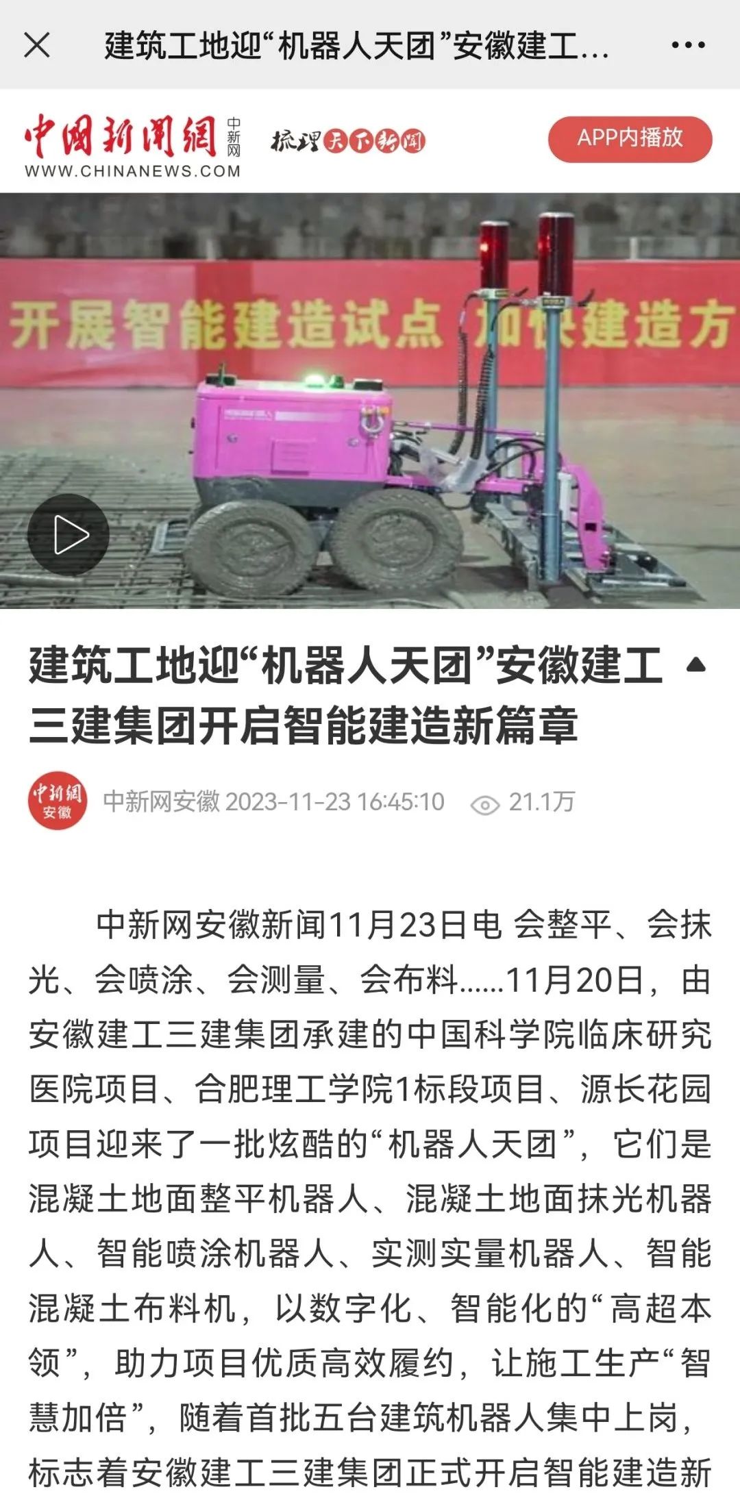 11月23日,中新網(wǎng)、安徽國資、合肥晚報(bào)以“建筑工地迎‘機(jī)器人天團(tuán)’安徽建工三建集團(tuán)開啟智能建造新篇章”為題,專題報(bào)道公司首批引進(jìn)五臺(tái)建筑機(jī)器人助力項(xiàng)目高質(zhì)量建設(shè),開啟智能建造新篇章,受到廣泛關(guān)注。截至發(fā)稿時(shí),閱讀量已超20萬次。