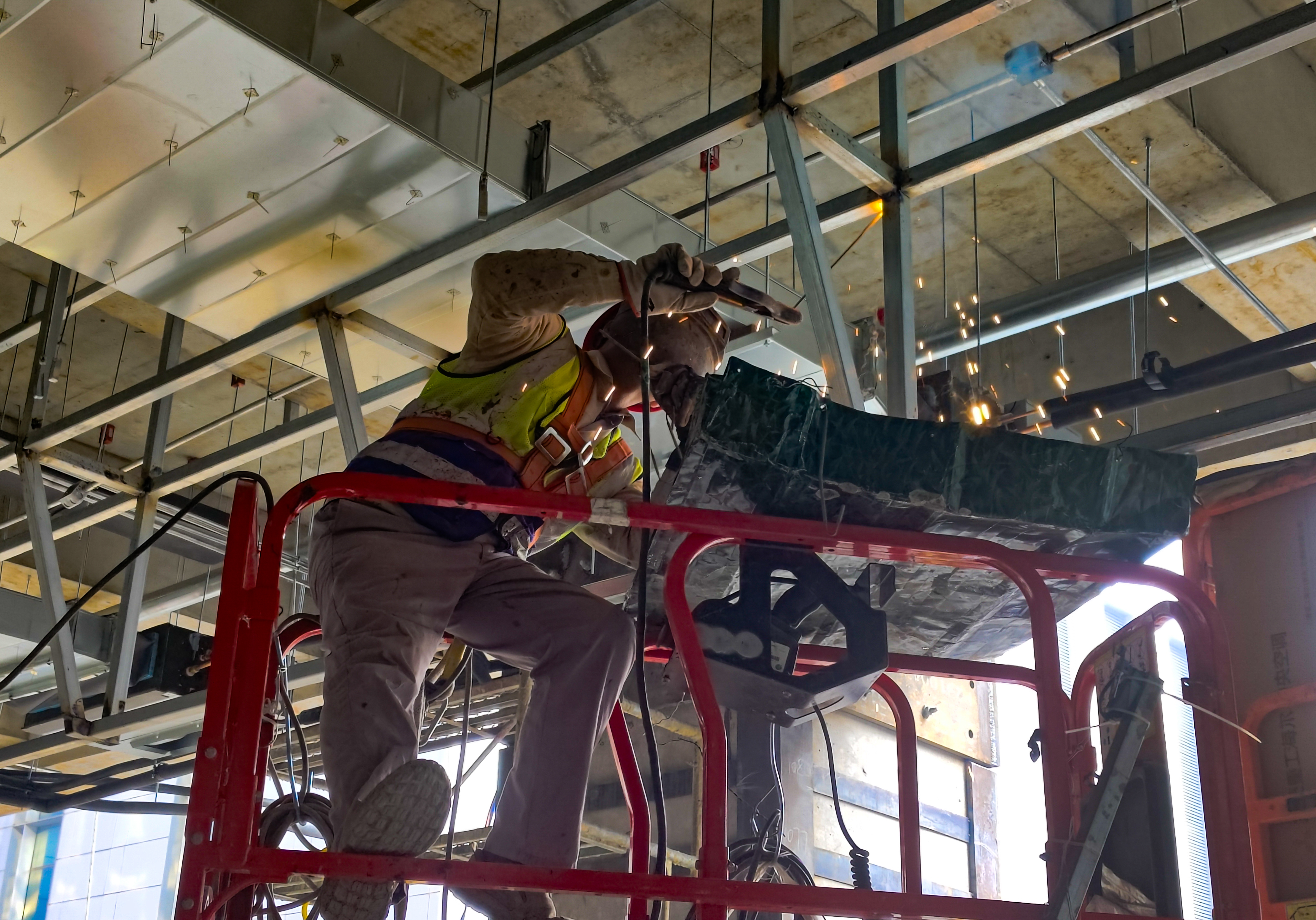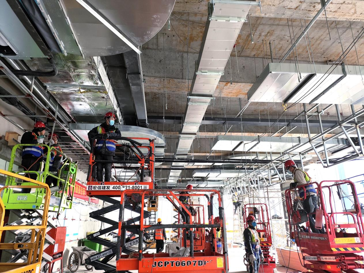 3層樣板區:輕鋼龍骨隔墻骨架已完成,隔墻封板已完成,地坪澆筑已完成,頂面龍骨施工已完成,封板施工已完成,燈膜安裝已完成,頂面消防管道已完成。共完成1至3層總工程量的25%。