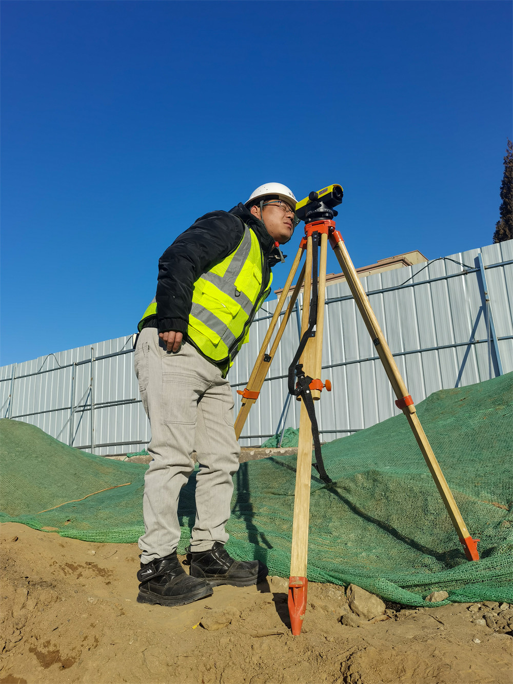 “傾心于事業,專注于崗位,以實際行動詮釋愛崗敬業!”測量員葉杰站在基坑邊進行測量工作。