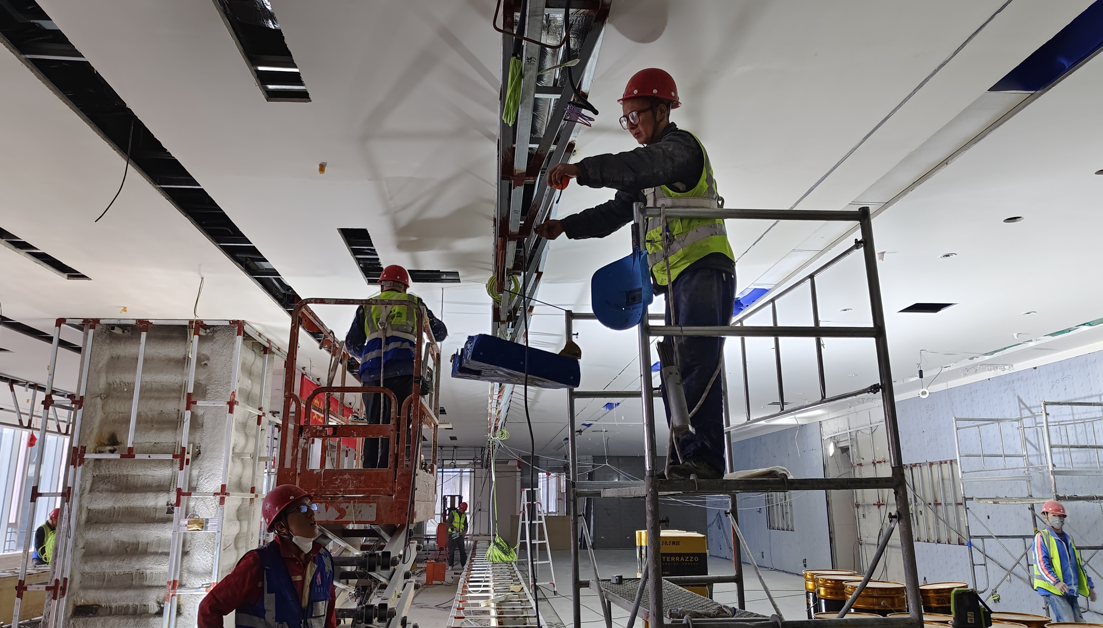 在最后沖刺階段,項目團隊引入噴涂機器人參與室內噴涂作業,制定人機協同施工管理方案,針對室內墻面、天花板等噴涂難點,充分發揮機器人作業噴點均勻、壓力穩定、節省耗漆量等優勢,同時智能無人操作避免了高空作業危險,縮短了工期,極大地提升了噴涂作業施工效率與質量,為項目的圓滿完成提供了堅實的技術保障。