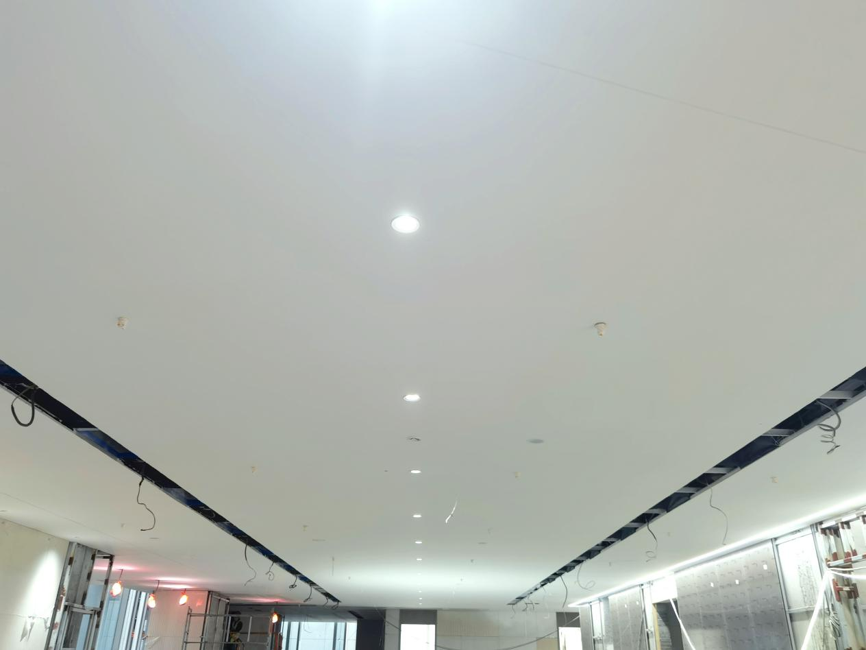 ②樓層裝飾裝修及安裝施工:輕質隔墻已全部完成,頂面封板完成,頂面安裝工程已完成95%,正在進行機電、空調、智能化等收尾工作;墻面裝飾基層已完成,墻頂面飾面板安裝完成45%,木門安裝完成60%,核心筒外圍以及樓梯間地磚鋪貼完成,衛生間防水已完成,衛生間地磚鋪貼已完成,衛生間墻磚已完成,電梯廳墻磚已完成,自流平完成95%,石塑地板安裝完成30%。