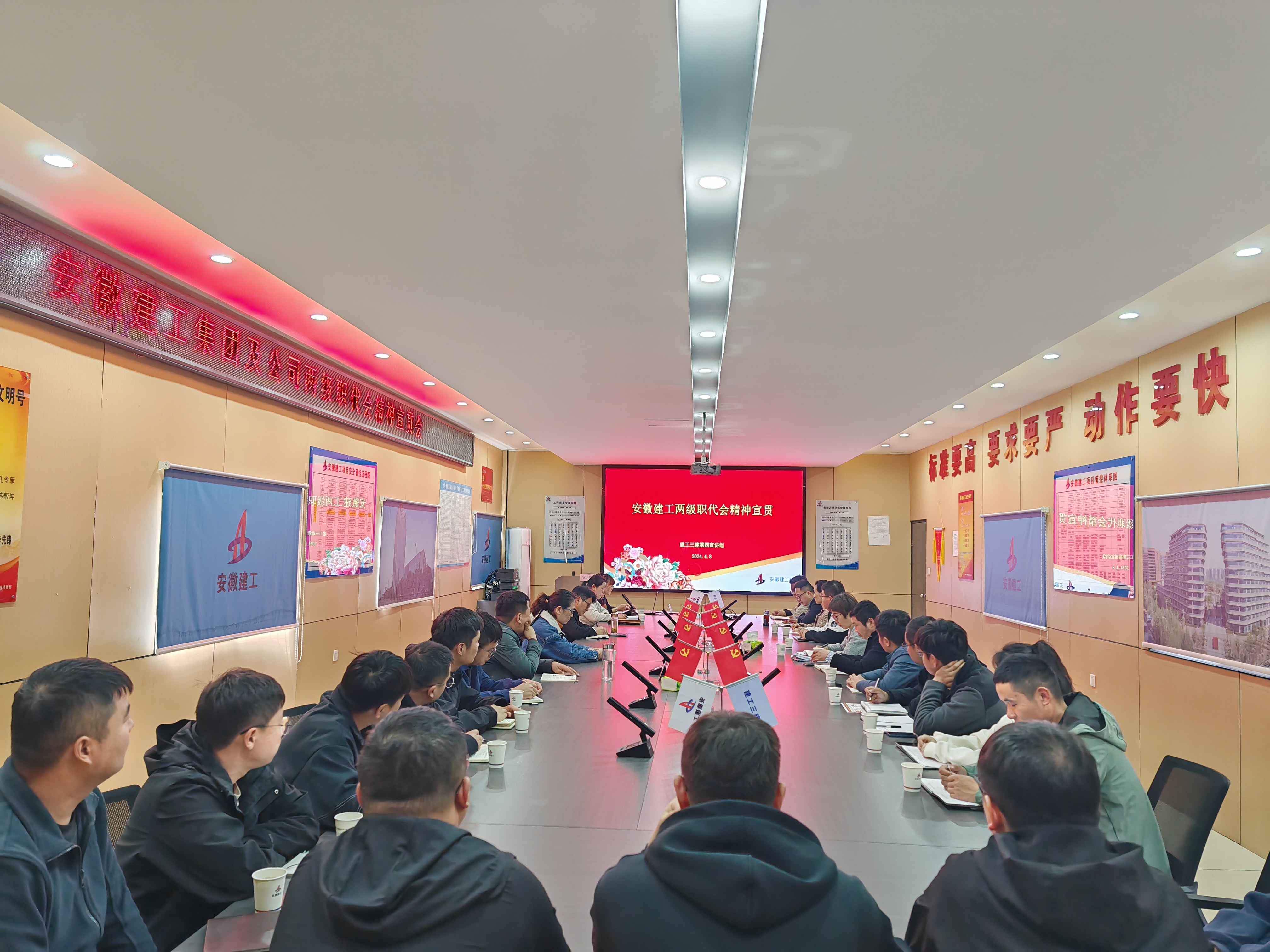 4月8日下午,公司第四宣講組赴八分公司大圩金葡萄家園二期項(xiàng)目開展兩級職代會(huì)精神宣貫,合肥市第二人民醫(yī)院感染病區(qū)建設(shè)項(xiàng)目、新合肥西站西廣場及地下配套停車場項(xiàng)目等有關(guān)項(xiàng)目人員40余人參加此次宣貫會(huì)。會(huì)上,宣講組通過總結(jié)工作、分析形勢、統(tǒng)一思想、凝聚力量,使一線職工更加深刻領(lǐng)會(huì)了兩級職代會(huì)精神。宣講團(tuán)成員于偉潔對十佳項(xiàng)目經(jīng)理王冬冬、高攀攀的事跡進(jìn)行了宣講,以榜樣力量傳遞正能量,增強(qiáng)了項(xiàng)目職工做好本職工作、珍惜所在崗位、創(chuàng)新工作做法、持續(xù)推進(jìn)項(xiàng)目管理能力再上新臺階的信心和勇氣,與會(huì)職工深受鼓舞,與兩名優(yōu)秀項(xiàng)目經(jīng)理項(xiàng)目探討管理工作中的優(yōu)秀經(jīng)驗(yàn)。