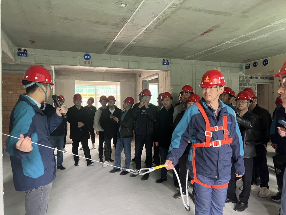觀摩人員一行聽取了項目工程概況以及質量、成本、安全等方面管控措施的匯報,重點參觀了項目智慧展廳、5#樓樣板間、機器人停放區及施工作業層,并就項目相關亮點做法進行深度交流,項目經理姜正寶就安全管控措施及主體結構施工工藝與觀摩人員進行詳細探討。