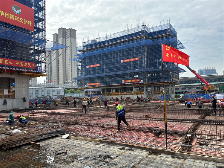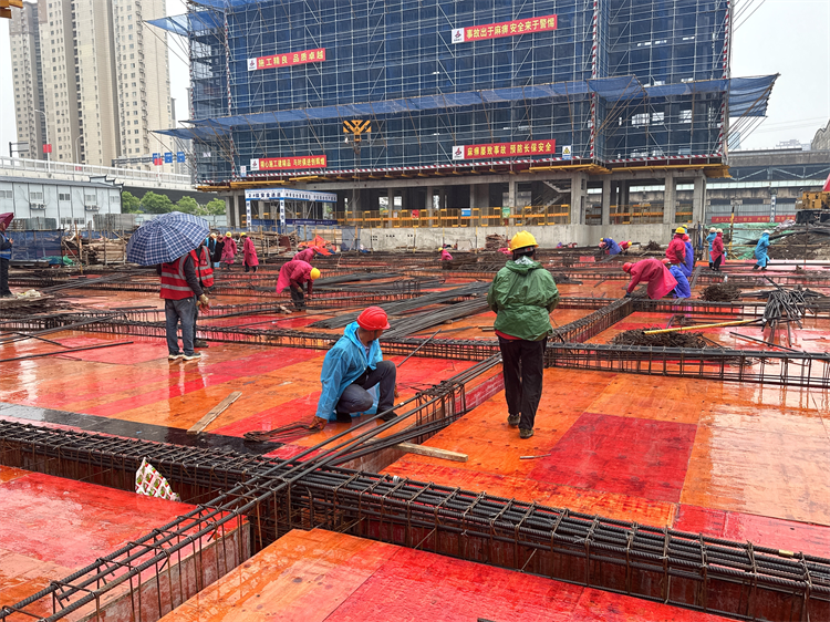 項目迅速組織召開勞動競賽工作小組會議,充分發揮“兩個作用”匯聚生產動能。項目黨員充分發揮先鋒模范作用,沖鋒在前,引領項目全體職工統一思想、團結奮斗,咬緊關鍵工期節點不松口。面對鋼筋原材不足難題,項目發揮釘釘子精神,加強溝通對接,加快推進鋼筋原材進場工作,同時積極同聯合體單位協商臨時借調鋼材。針對連續陰雨天氣影響施工進度問題,項目青年突擊隊集思廣益,多次研討確保節點工期任務的解決方案,同時對人防口部墻板集中部位采用架設固定式遮雨棚及移動式遮雨棚措施,給工人提供安全的雨天施工作業條件。