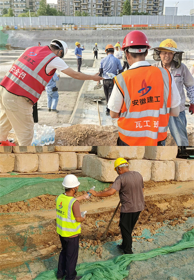 為切實保護廣大工友身體健康,保障項目施工進度,各項目部采取調整作業時間,避免高溫時間作業,為操作工人發放仁丹、藿香正氣水、鹽汽水、冰棒等防暑降溫物品,準備臨時納涼房等防暑降溫措施,以實際行動, 為建設者撐起生命安全的“清涼傘”。