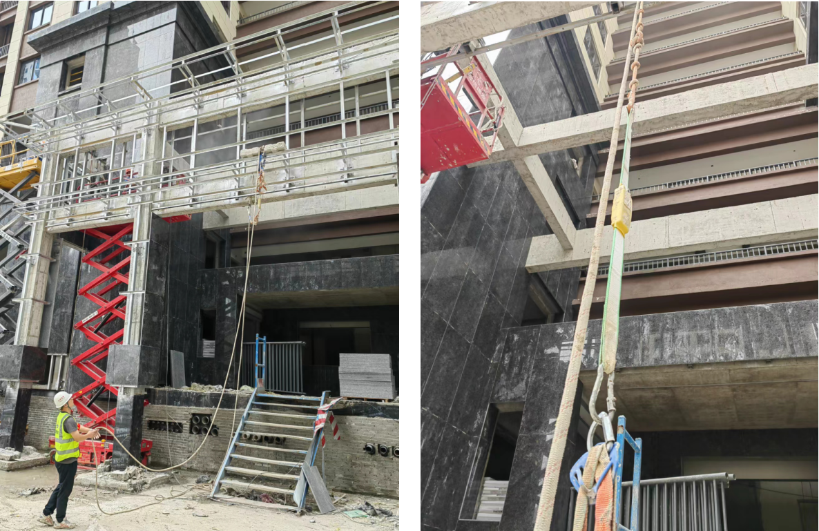 項(xiàng)目部在“安全生產(chǎn)月”期間加大巡查力度,對作業(yè)前的安全準(zhǔn)備工作詳細(xì)策劃并指導(dǎo)實(shí)施。項(xiàng)目正值外墻裝飾階段施工,安全員在提醒作業(yè)人員系掛安全帶的基礎(chǔ)上,定期對采購的安全帶防墜落緩沖包進(jìn)行試?yán)囼?yàn),驗(yàn)收合格后方可使用。同時對作業(yè)人員進(jìn)行交底,包括安全帶的正確配置、系掛點(diǎn)的位置選擇、安全繩移動距離及有效長度等。