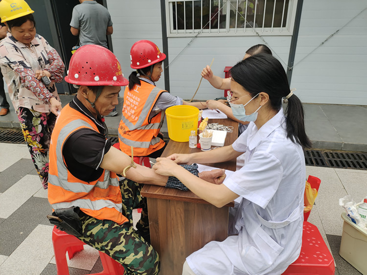 炎炎夏日,大圩金葡萄家園二期項目工地上“熱火朝天”,施工一線的建設者們堅守崗位,正緊鑼密鼓地搶抓工期,確保實現年底竣工驗收目標。為扎實推進“我為群眾辦實事”實踐活動,有效保障工人身體健康,15日上午,大圩金葡萄家園二期項目組織開展為全體參建工友免費健康體檢活動,為高溫下的勞動者健康護航。