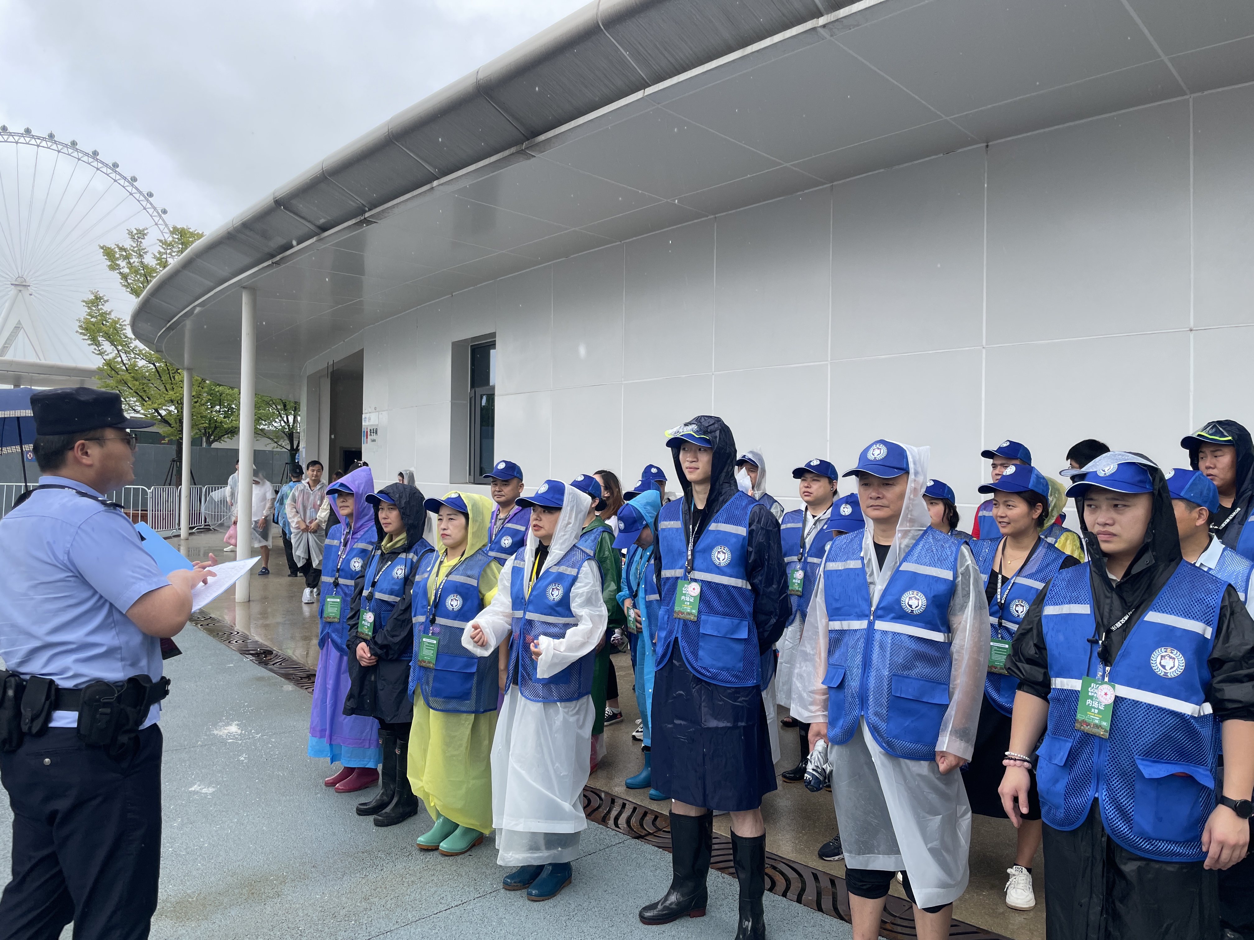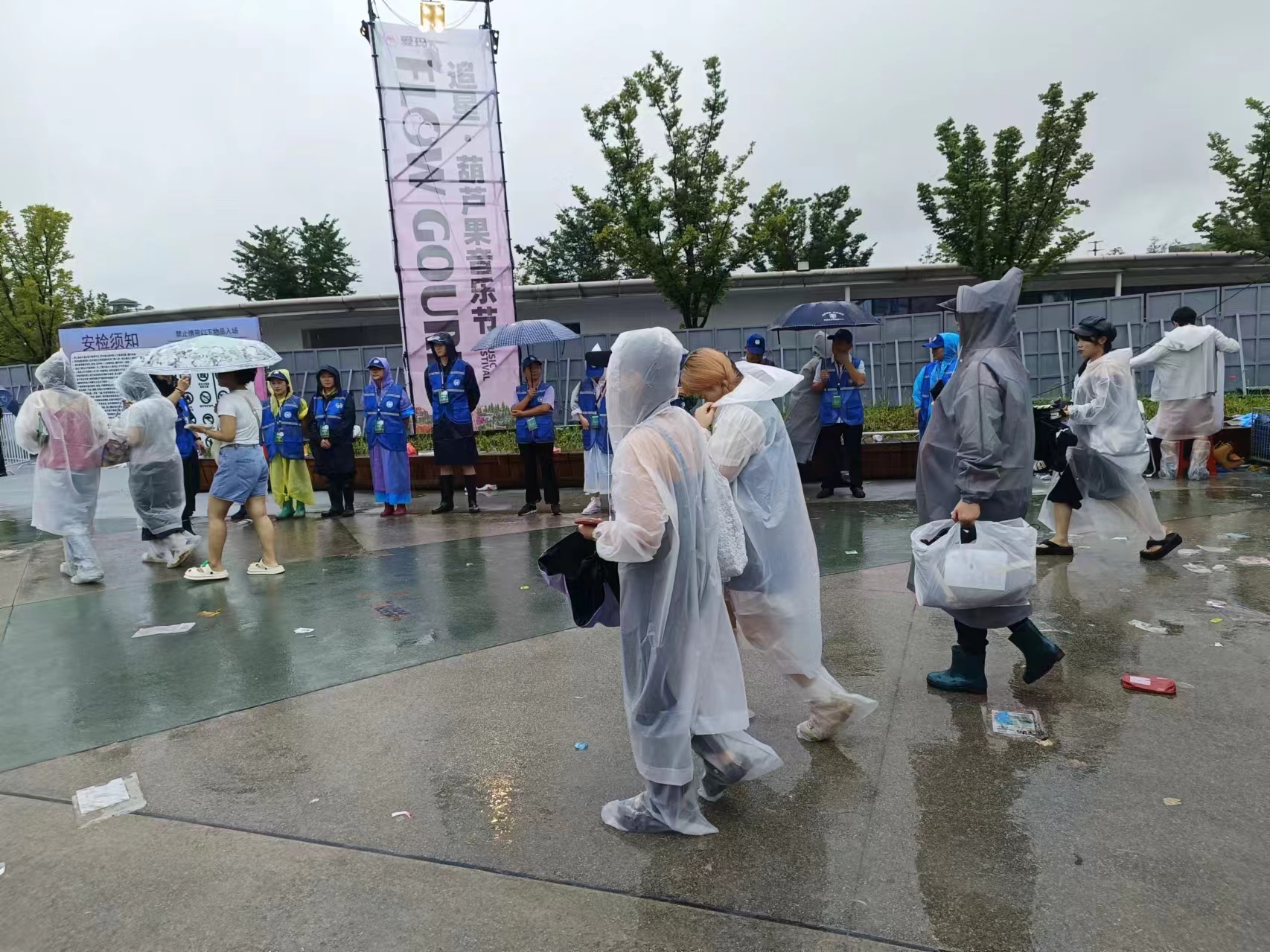 義警服務(wù)隊(duì)員們早早來到現(xiàn)場,他們身穿統(tǒng)一的制服,冒著大雨,毅然決然地投入到維護(hù)現(xiàn)場秩序的工作中。在面對惡劣的大暴雨天氣,路面濕滑泥濘、視線模糊,但“蓮豸”志愿者義警服務(wù)隊(duì)的成員們卻毫不退縮。在熙熙攘攘的人群中,他們穿梭在現(xiàn)場檢票口,耐心細(xì)致地引導(dǎo)樂迷們有序入場,確保每一個人都能安全、順利地進(jìn)入音樂節(jié)。
