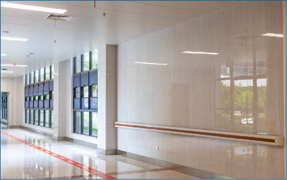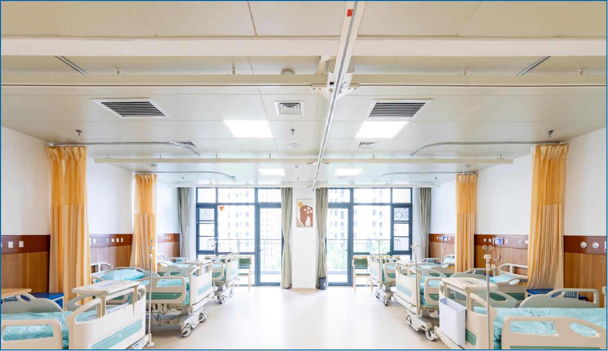 設計上,摒棄了傳統(tǒng)醫(yī)院病房樓的直通式走廊,形成類似“街道+廣場”的空間,成為充滿生活氛圍的社區(qū)交往空間,延續(xù)家居感覺。根據不同使用人群(失能、失智老年人、自理老人)的需求,設置不同的配套服務功能,以康養(yǎng)軸連接南、北、中部各功能模塊,利用無障礙人行通道形成風雨無阻的步行系統(tǒng)。設置智能適老化看護管理系統(tǒng)和無障礙智能載人天軌系統(tǒng),施工策劃全面考慮運營需求,確保系統(tǒng)平穩(wěn)運行且無交叉、無干擾。