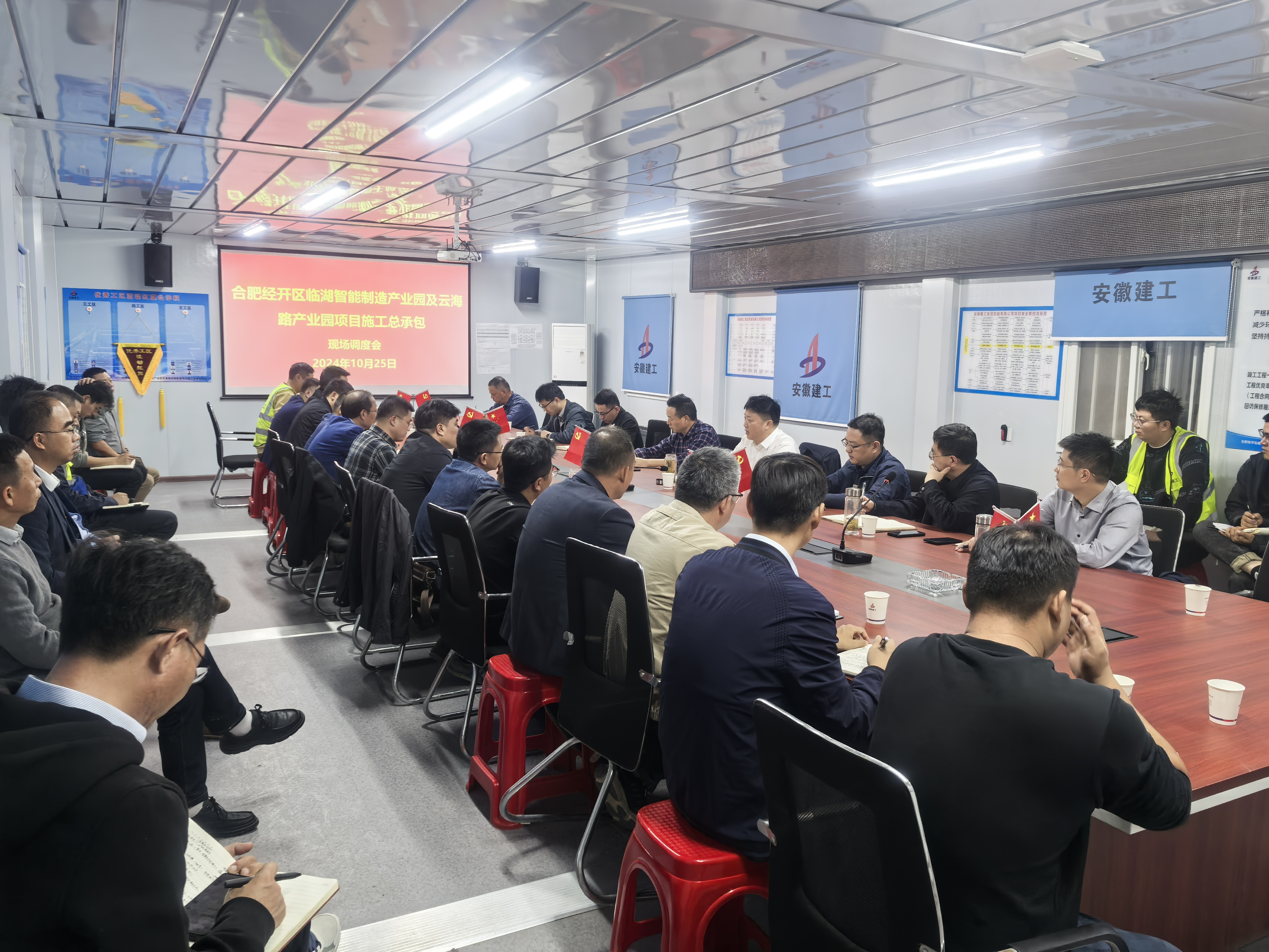 10月25日晚,大眾科技研發三期和臨湖智能制造產業園項目召開現場調度會,就推進兩項目高質量、高效率建設進行再動員、再部署、再發力。建工股份黨委委員、副總經理、建工三建黨委書記、董事長何洪春主持會議并講話。公司黨委委員、副總經理司馬文參加會議。