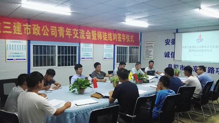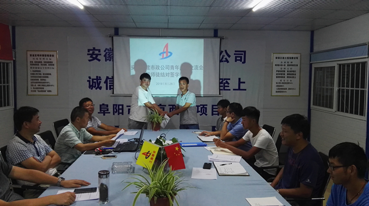 日前,市政公司在阜陽市北京西路工程項(xiàng)目部會(huì)議室,組織開展了青年交流會(huì)暨2018年度師徒結(jié)對簽字儀式。市政公司近三年以來進(jìn)場的大學(xué)生、阜陽市北京西路工程項(xiàng)目全體管理人員及部分科室負(fù)責(zé)人和領(lǐng)導(dǎo)班子成員參加了活動(dòng)。