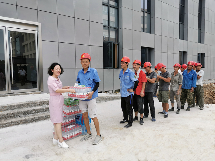 裝飾公司支部書記高莉7月23日下午至肥東一中老校區新建多媒體教學樓項目開展送清涼活動