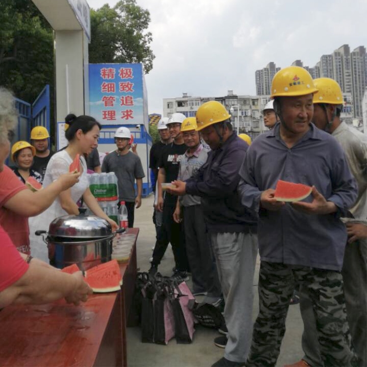 近期連日高溫炎熱,驕陽似火,酷暑難耐。安徽三建十公司蜀山區動力三村改造項目一線施工人員依然堅守在各自崗位?!澳銥槲抑邩谴髲B,我為你送綠豆甜瓜”。三建人揮汗奮戰的精神,感動了當地社區百姓。2019年7月25日下午三時,七里塘社區黨委副書記孫妹娟組織號召社區8名志愿者集中前往動力三村改造項目的施工現場開展“送清涼”活動,安徽三建十公司支部書記吳明寬、安全科長張玉保、項目經理李其云等人員參加活動。