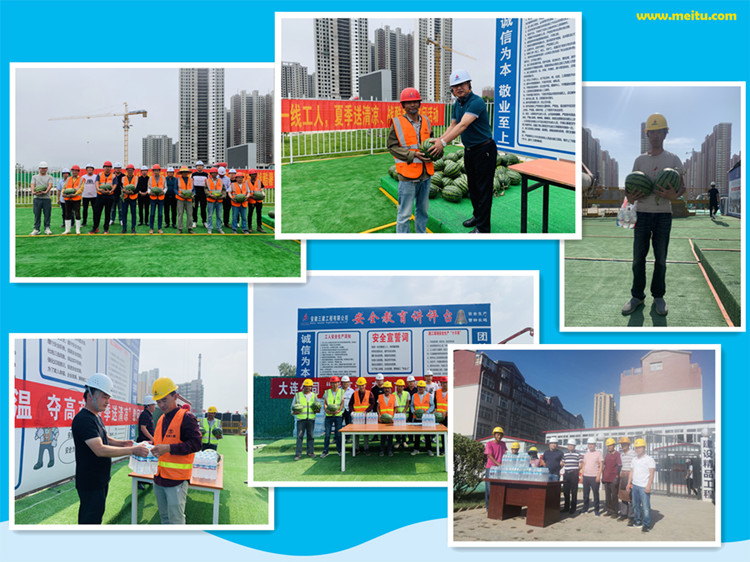 6月11日至6月15日,大連公司工會主席石業兵帶隊,先后前往煙臺陽光海岸四期、五期項目部,濟南君逸府項目部、瀾湖郡幼兒園項目部、濟陽未來城A5項目部的施工現場,看望慰問一線工人,向高溫下堅持工作、堅守崗位的一線職工進行慰問,并送上防暑降溫的藿香正氣液、西瓜、礦泉水等慰問品。“送清涼”活動猶如夏日里的涼風,沁潤著職工們的心田,激發了職工們的工作熱情。大家表示,一定堅守崗位、認真工作,在戰高溫的同時,戰疫情、搶工期、保目標、促超產,確保完成各項生產任務。