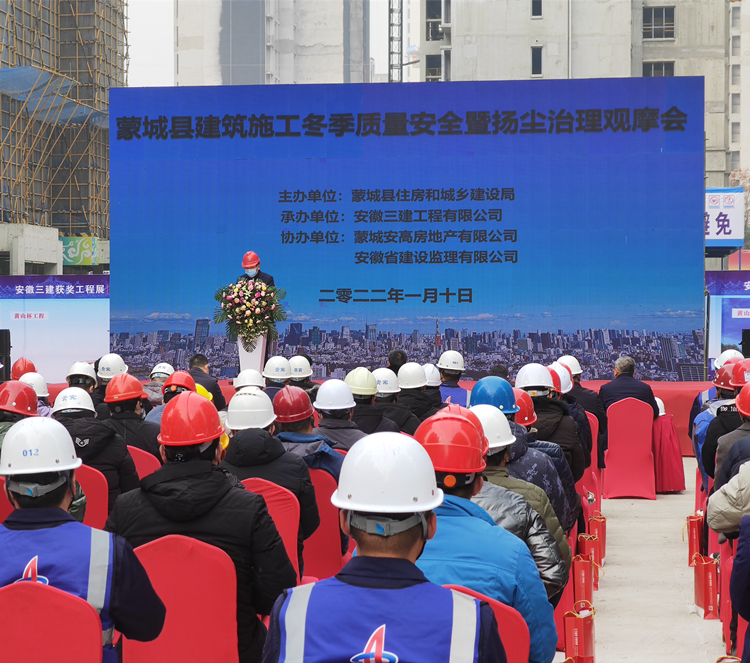 為切實做好蒙城縣建筑工程冬季施工質量安全及揚塵治理管理工作,加強施工現場管理經驗的學習與交流,提高從業人員質量安全生產意識,推進質量安全生產標準化工作落實到位,1月10日上午,蒙城縣建筑施工冬季質量安全暨揚塵治理觀摩會在安徽三建承建的蒙城高速時代首府項目順利召開。 蒙城縣副縣長劉鵬,縣住建局、應急管理局、人社局等相關部門負責人以及全縣所有在建項目業主代表、項目經理、總監約200人參會。