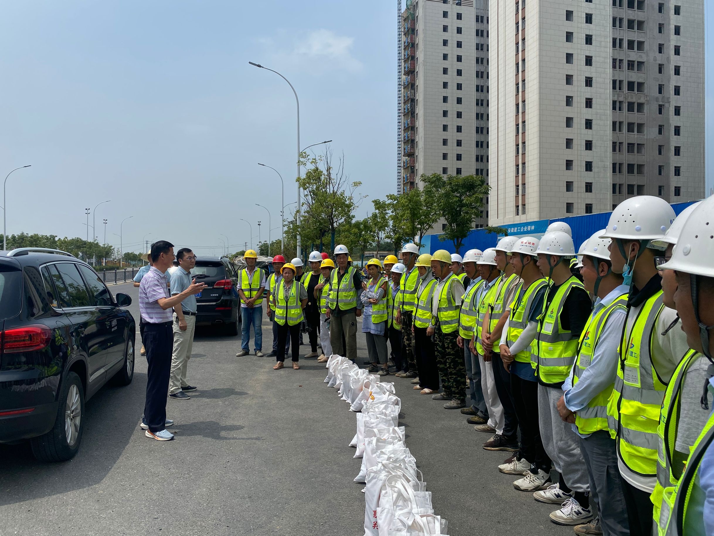 近日天氣持續高溫,7月19日上午,合巢產業新城指揮部辦公室副主任、黨支部書記張維鑄,建發局副局長肖勇一行人代表安徽巢湖經濟開發區總工會帶著毛巾、花露水等消暑降溫慰問品來到合巢產業新城郭塘新村、映湖公租房項目施工一、二標段,看望、慰問奮戰在一線的建設者。一行人向施工單位表示感謝;其次,要求在抓工程進度時,一定要高度重視施工安全,叮囑建筑工人在施工中注意防暑避暑。