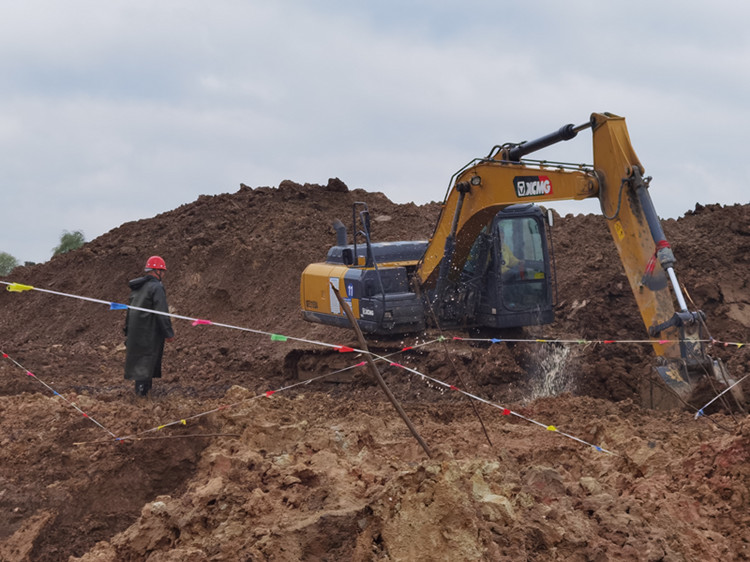 防汛現(xiàn)場,挖掘機(jī)在指揮下同時開挖溝槽,將河塘積水自董崗健康驛站北側(cè),順梅城路到將軍嶺路,由北向南成90度繞開障礙物,引入肖小河左支流下游,共計(jì)溝槽開挖近400米。