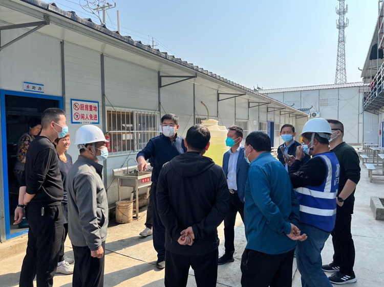 4月20日上午八點半蕪湖市鳩江區區委常委、常務副區長戴鳴帶隊一行人至安徽省公共衛生臨床中心(蕪湖)項目進行疫情防控專項檢查,詳細了解項目規模、封閉管控人數、核酸檢測采樣情況等基本信息,認真查看項目大門及生活區封閉情況,要求加強巡查檢查,強化宣傳引導,確保人員自覺不外出、不串門、不扎堆,共同筑牢疫情防控安全防線。走進生活區慰問封閉管理的項目一線工人,仔細詢問民工食堂物資儲備情況。戴區長提出要高度重視物資保障工作,想盡一切辦法做好項目人員米、面、蔬菜等生活必需品供應,并將屬地村支部張書記介紹給項目,要求如有困難及時對接屬地,保障項目人員生活物資的正常供應。