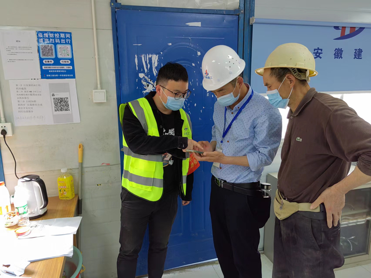 在中海橙郡項目的孔軍,從3月起就封閉在項目沒有回過家,他的兩個孩子年齡都較小,每天在家哭鬧著要爸爸,他強忍著對妻兒的思念,堅守在項目一線。每天早上5:30,他便準時來到項目大門口,核驗雙碼,測量體溫,登記進場人員信息,保證所有工人一周雙檢,編制一人一檔。一開始很多工人不會使用皖事通出示雙碼,他耐心教導工人使用,部分工人覺得每天都要檢查很麻煩,他依舊耐心勸導工人們?nèi)チ私鈬艺撸屗麄冎垃F(xiàn)在所做的一切努力都是為了保證他們每日能平安放心地生產(chǎn),工人們也漸漸了解并支持他的工作。