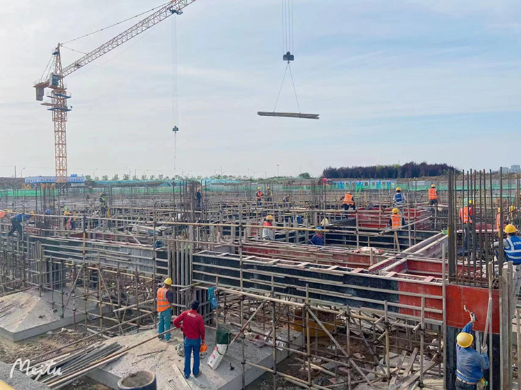 目光轉至文化中心檔案館項目,120多名現場人員正有序施工作業,40名鋼筋工不停地穿梭在負一層,他們雙手并用,技術熟練,全面推進滿堂架搭設與鋼筋綁扎工作;再看那45名木工,分別站在各施工點位,安裝、調整模板;瓦工、機械工、信號工每個操作工種都高效有序的完成他們心中的既定目標。