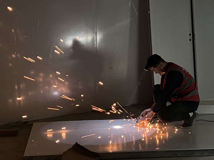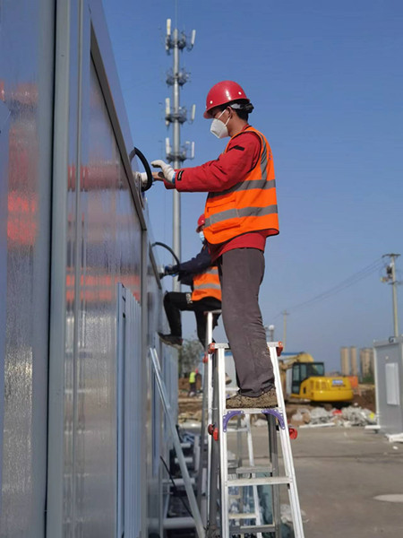 夜幕降臨,合肥春天的夜晚仍夾雜著絲絲涼意,肥西縣疫情隔離點備用區(三期)工程,塔吊在大功率的光源下仍進行著吊裝作業,在吊臂下落的打包箱配件的不遠處,二公司安全員任杉杉戴著安全帽,向著吊車司機喊道“慢、慢、慢”,在打包箱房頂配件緩緩落在箱房的支撐點之時,數名操作工立即手持電動機械找準各個支撐點位,用最快速度完成安裝工作。
