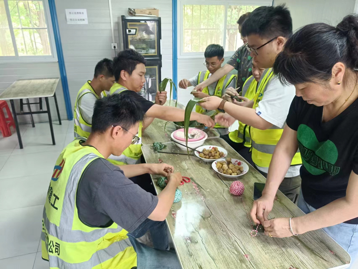 活動現場洋溢著濃厚的節日氛圍,大家圍坐在一起,折粽葉、填糯米、加蜜棗、系棉線,邊包粽子邊交流技巧,忙得不亦樂乎。經過一個多小時的努力,一個個形狀各異的粽子展現在大家面前,看著自己辛勤的成果,大家心里樂開了花。紛紛感嘆:“雖然不在家里過端午,但能在項目部這個大家庭和同事一起包粽子很熱鬧,真切地感受到了家一樣的溫暖”。