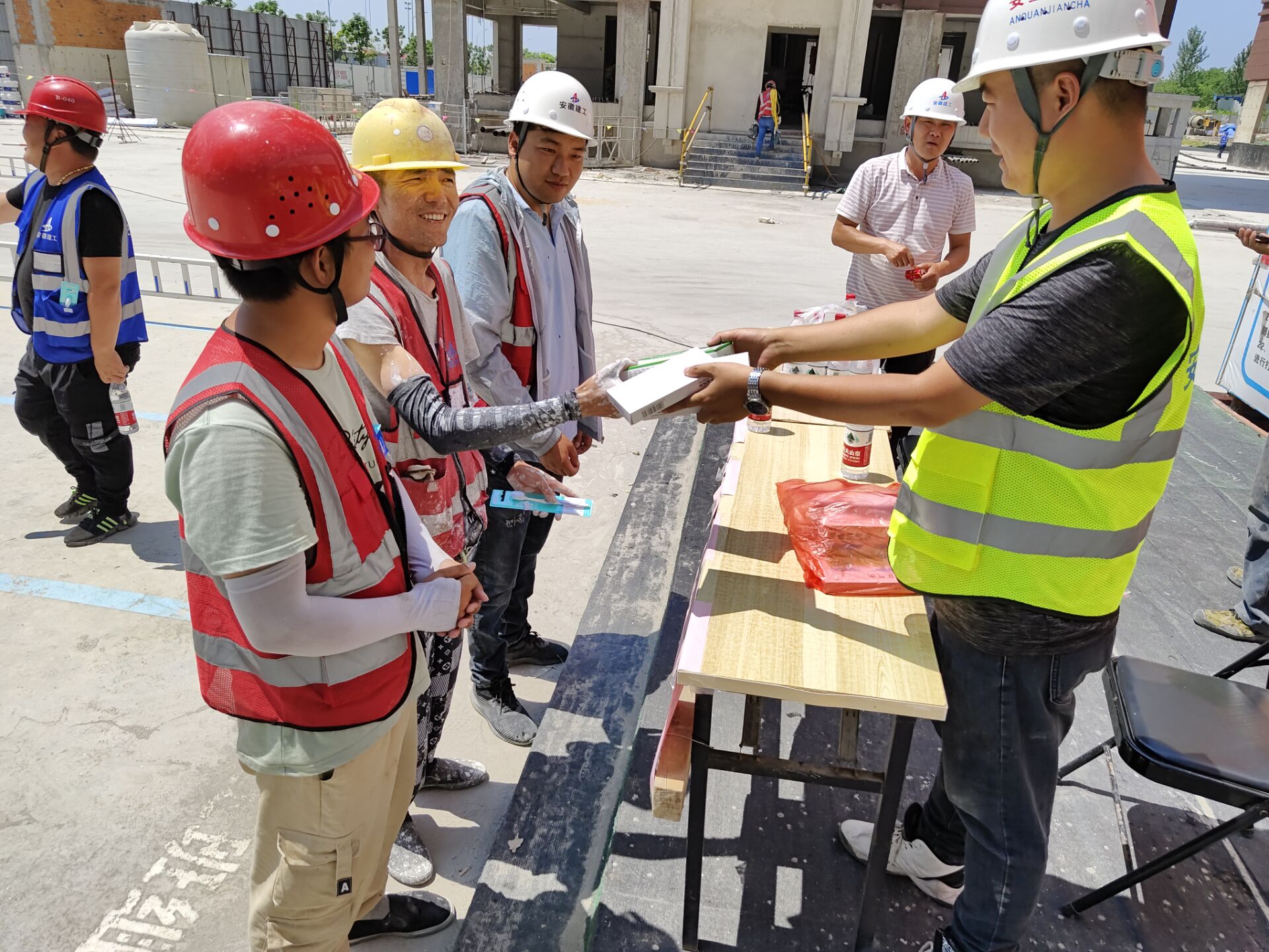 隨后,張科長及項目管理人員向一線工人發放防暑降溫藥品、物品,提醒工人避開高溫時段,安全作業。