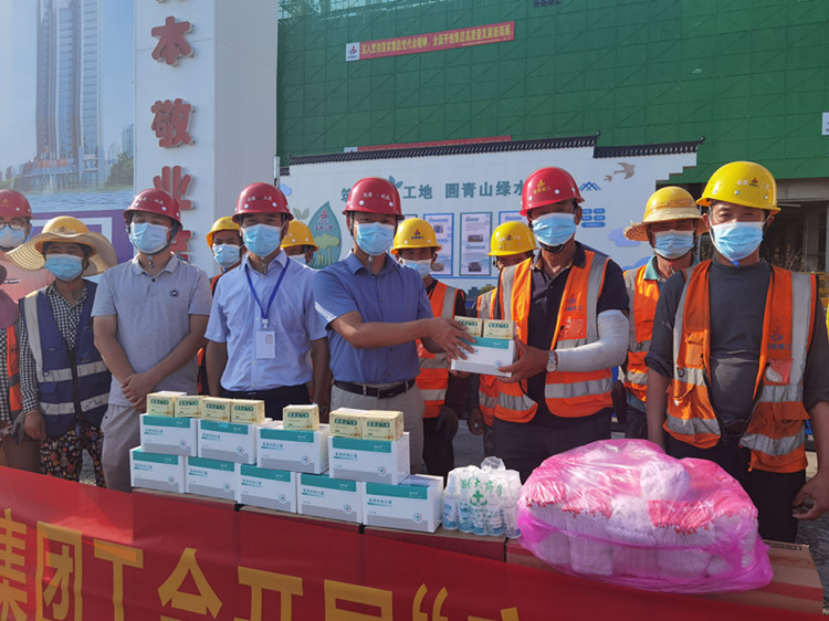 盛夏已至,氣溫持續(xù)攀升。 6月29日下午3點,肥西縣城鄉(xiāng)建設(shè)投資(集團)有限公司總經(jīng)理楊志明,副總經(jīng)理、工會主席李根,副總經(jīng)理葛偉一行來到安徽三建肥西產(chǎn)融項目進行調(diào)研慰問。為肥西產(chǎn)融項目的廣大一線建設(shè)者們送來了礦泉水、藿香正氣水、風油精、口罩、消毒液等防暑防疫必需品,在烈日當下的施工現(xiàn)場為項目一線建設(shè)者們送上一絲“清涼”,一份關(guān)懷。隨后,步入施工現(xiàn)場開展慰問活動,為一線職工分發(fā)物資。