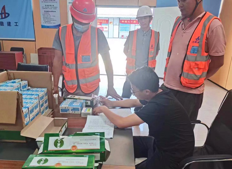 驕陽似火,熱浪襲人。為認真做好高溫天氣勞動保護工作,切實維護參建工人的職業安全與健康權益,深入落實安全生產月活動,近日,七公司組織在肥地區項目開展“送清涼”活動。本次活動涉及合肥一中東校區和御景黃城兩個項目、近30個班組,約1400名民工。發放的防暑降溫物品包括人丹、十滴水、清涼油及藿香正氣口服液等,合肥一中東校區項目每天還為班組工人發放兩次雪糕冷飲。在發放現場,項目管理人員詳細告知工人藥品使用方法與功效,并細心叮囑工人夏季要注意防暑降溫,防止中暑。