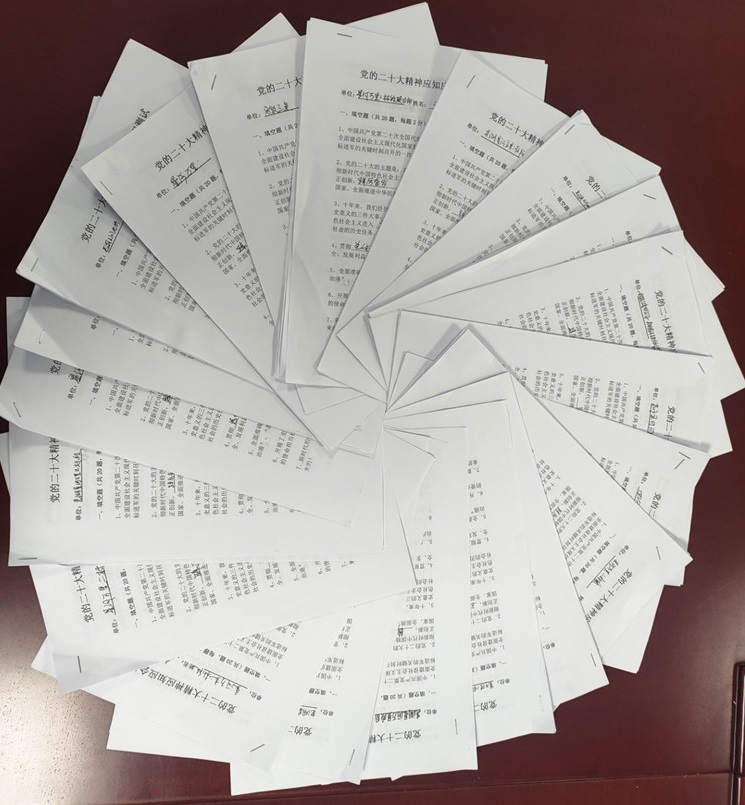 此次測試內容緊緊圍繞黨的二十大報告及新修訂的《中國共產黨章程》,題型包括填空題、選擇題、判斷題、簡答題等形式,著重測試黨員及職工群眾對黨的二十大會議精神的掌握情況。測試現場,大家仔細審題,認真答卷,展現出良好的學習作風與端正的考試態度 ,營造了“以考促學、以學促用”的濃厚氛圍。