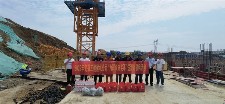 8月3日,驕陽似火,熱風撲面,建機公司黨總支書記李朝進一行赴長豐縣吳山鎮第二工業社區項目部開展“送清涼”慰問活動,為項目部一線職工發放毛巾、香皂、人丹、清涼油、風油精、飲料、礦泉水等防暑降溫物資。分公司有關部門負責人參加慰問活動。
