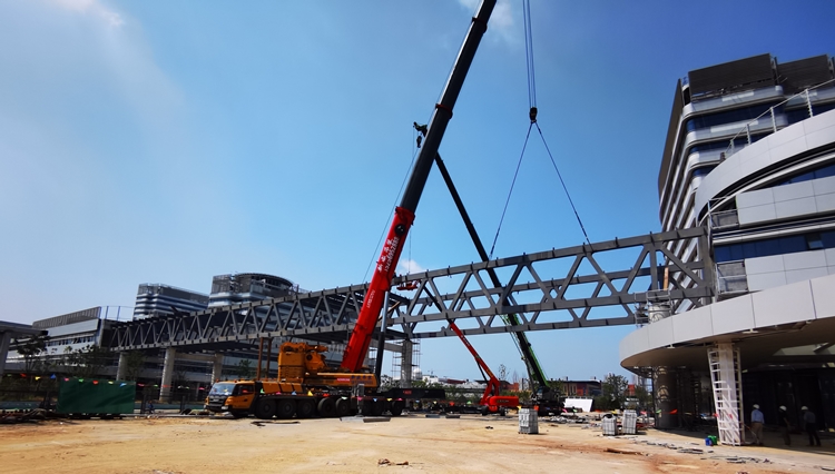 本工程南北區(qū)連廊采用鋼桁架連廊,桁架總跨度105.551m,桁架高5m,分3段吊裝,第一段跨度40.599m,第2段跨度35.293m,第3段29.066m,單榀桁架最重52t,采用600噸汽車吊吊裝,吊裝工作半徑25m。吊裝前,對吊裝區(qū)域全封閉,拉設(shè)警戒線,管理人員全部到位,各司其職。吊裝過程嚴(yán)格按照各方簽認(rèn)的施工方案實(shí)施,對吊裝過程中出現(xiàn)的技術(shù)難題逐一解決;安全方面,邀請公司、分公司安全管理人員進(jìn)行專業(yè)指導(dǎo)。經(jīng)過多方努力,最終鋼連廊順利吊裝完成。