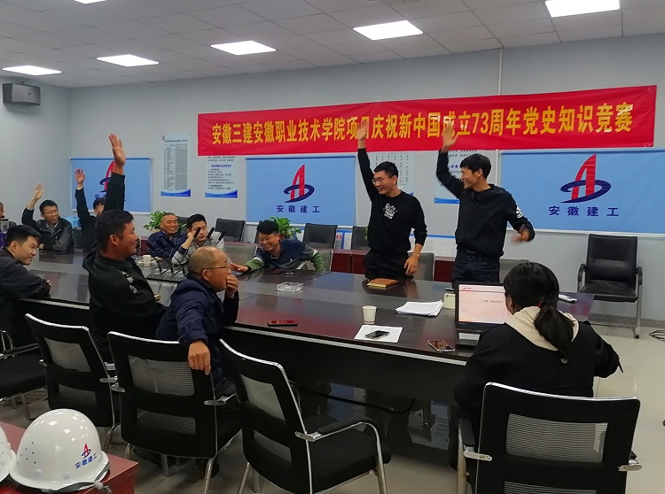 10月1日,滁州天長恒大項目部組織了“升國旗唱國歌”活動;國慶當晚,江淮學院項目部組織了“歌唱祖國,慶祝中華人民共和國成立73周年卡拉OK比賽”,分公司領導班子不僅深入一線與職工們一起引吭高歌,還特地邀請部分職工家屬來請到項目上,讓聚少離多的他們能夠和家人一起歡度佳節;10月5日,安徽職業技術學院實訓中心項目部開展了“慶祝新中國成立73周年黨史競賽”活動。