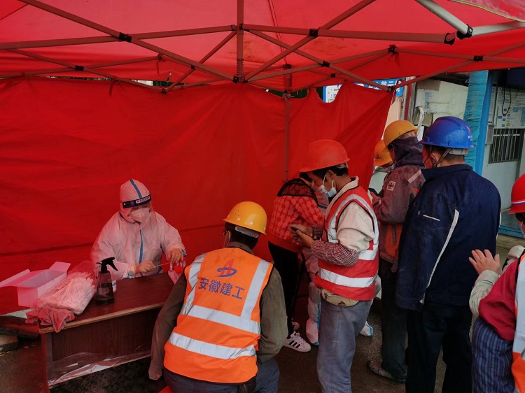 在七公司御景黃城項目辦公區(qū)門口,班組工人、附近群眾自覺間隔一米距離,排起長隊,測溫、掃碼、采樣,每項工作都有條不紊地進行著。正在進行核酸檢測的工人表示:“收到項目通知就過來了,現(xiàn)在做核酸更方便了,感謝政府,感謝項目!”