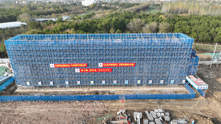 生產方面,現場科學謀劃,因現狀道路蘭渡路位于項目紅線內,將項目用地分為南北兩塊區域,137路公交車通行路線仍途經蘭渡路,對項目整體進度造成了極大影響。項目召開專題研討會,決定兵分兩路,一方面積極與大建辦、交管部門、公交集團協調溝通,盡快完成蘭渡路道改封閉事宜;另一方面,考慮施工現場不具備大面施工條件,項目謀劃永臨結合作業,充分利用現有場地條件,將室外永久圍墻及室外永久道路提前謀劃施工,在前期取得了顯著成效。在關鎮村155畝場地移交后,項目整體具備大面施工條件,在一天之內完成關鎮區域所有清表工作。
