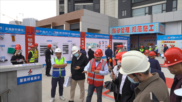在現場觀摩會上,工地觀摩的講解員為大家介紹了項目堅持樣板先行原則,建設智慧工地等提高工程質量、保障安全施工的經驗,并就項目室外安全文明檢驗區、施工相關工藝、材料樣板、室內土建精裝工藝和交付板房等方面的優秀做法進行了溝通交流。