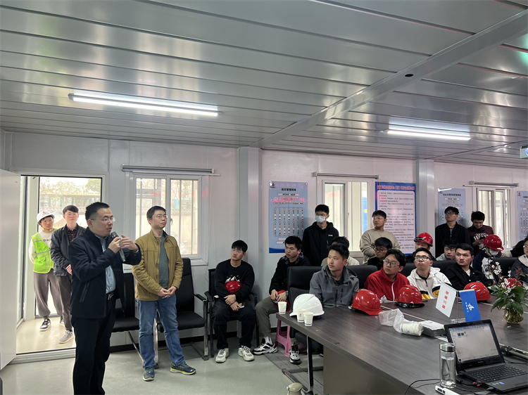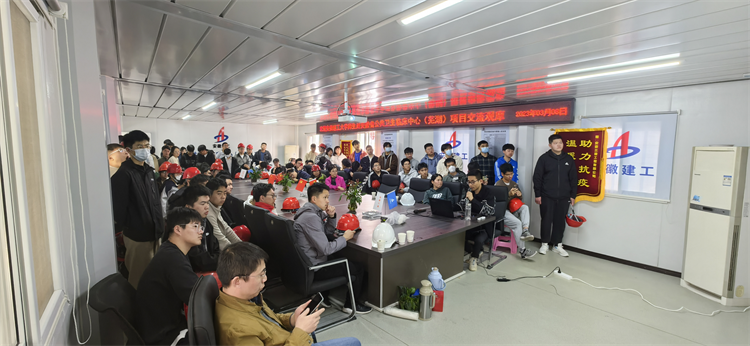 在項(xiàng)目會(huì)議室,呂遠(yuǎn)對(duì)同學(xué)們的到來表示歡迎,他表示,作為校友很榮幸代表公司負(fù)責(zé)本次觀摩活動(dòng)。本次精心挑選了在建省重點(diǎn)工程——安徽省公共衛(wèi)生臨床中心(蕪湖)項(xiàng)目為2023級(jí)準(zhǔn)畢業(yè)生在不久后快速轉(zhuǎn)換角色奠定基礎(chǔ)。隨后,播放了安徽三建宣傳片,項(xiàng)目技術(shù)負(fù)責(zé)人對(duì)該項(xiàng)目工程概況、管理重難點(diǎn)、創(chuàng)新做法、施工亮點(diǎn)、黨群文化建設(shè)等方面進(jìn)行了介紹。學(xué)生們認(rèn)真聆聽,熱情交流。對(duì)企業(yè)概況和項(xiàng)目管理有了整體的認(rèn)識(shí)。