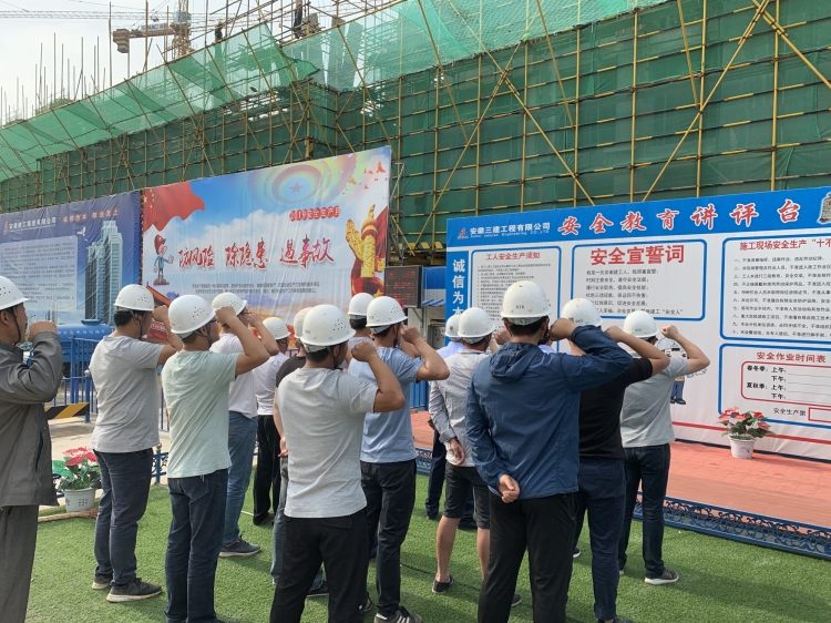 “我是一名安徽建工人,我鄭重宣誓,時刻注意安全,遵守安全法規,履行安全職責,提高安全技能,杜絕三違現象,保證四不傷害……”在安徽三建所屬多個項目上,近期都在組織開展安全宣誓活動。今年6月份是全國第18個“防風險、除隱患、遏事故”“安全生產月”。為牢固樹立安全發展理念,防范化解重大風險、及時消除安全隱患、有效遏制生產安全事故,公司于5月24日下發《安徽三建2019年“安全生產月”活動方案》,并于5月31日開展“安全生產月”啟動儀式暨安全宣誓、應急救援演練活動正式啟動“安全月”活動,全面啟動安全月活動,隨后,公司所屬各單位按照活動方案部署迅速行動、積極開展相關活動。5月30日至6月3日,七公司、門窗公司、五公司以及江西、蕪湖、大連、十公司、基礎、架業公司分別開展了宣誓、應急救援演練、安全警示宣傳、安全警示教育等活動。據悉,目前其他分公司也在積極籌備相關活動,“安全月”主題活動已然在公司大范圍開展起來。